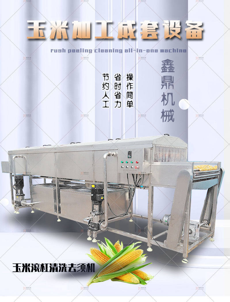 设备整机采用**304不锈钢材质制作而成,防腐、防锈,使用寿命长。玉米的输送采用滚杠式的输送方式,滚杠之间的间隙大小根据实际的玉米穗的大小来设定,利用滚杠的转动带动玉米的自转的转动,在滚杠的上下均设置高压喷头,可以采用上下对喷的方式,配合玉米的自行转动对玉米的表面进行清洗,利用高压将玉米须打掉。冲掉的玉米须和杂质会直接的落到下端的水箱的过滤网上。利用过滤网的双层拦截将杂质有效的过滤掉。清洗的用水经过过滤后落入循环水箱中,可以保证水的循环使用,有效的节约水源。